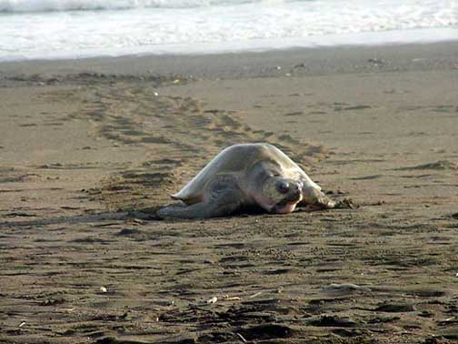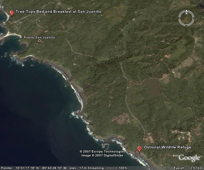 As seen on the satellite map below, the Tree Tops Bed and Breakfast Inn at San Juanillo is just a short distance from the Ostional National Wildlife Refuge (about 6km, 5 minutes aboard our boat) and the town of Nosara. Our proximity to the park allows us the unique opportunity to offer our guests a sea turtle safari which is your chance to view the Olive Ridley and Leatherback sea turtles in their natural habitat aboard Tree Tops private boat. The Ostional Wildlife Refuge, at Playa Ostional on the Nicoya Peninsula of Costa Rica, protects marine turtle species, such as the Olive Ridley (Lora) and Leatherback (Baula). The Olive Ridley Sea Turtles of Ostional are world famous for their Arribadas, massive turtle nestings and egg layings, when the nesting beach can be covered with thousands of turtles at once. Arribadas at this beach are considered the largest in the world, with as many as a million sea turtle eggs laid in the beach nesting areas each year. The Arribadas occur on a lunar cycle of approximately 28 days. The majority occur around the last quarter of the cycle although this event may take place at any time including the full moon and two Arribadas (first and last quarter) may occur in the same month. The size and duration of the Arribadas varies between the dry and wet seasons. Those occurring in the dry season of January to April tend to be smaller (approximately 5,000 turtles) and of shorter duration (less than four days). In the wet season of May to December, up to 300,000 turtles may lay over a period of eight to 10 days. Enjoy our hospitality and lodging at Tree Tops Bed and Breakfast and don't forget to schedule a swim with the sea turtles at Ostional Wildlife Refuge aboard Tree Tops own boat. |